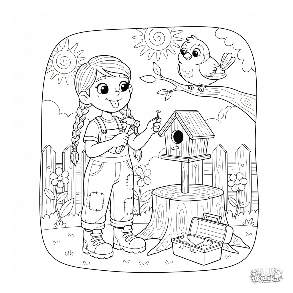 Раскраска для девочек 4-6 лет: весёлая девочка в комбинезоне мастерит маленький скворечник на пеньке в саду, за ней наблюдает воробей.