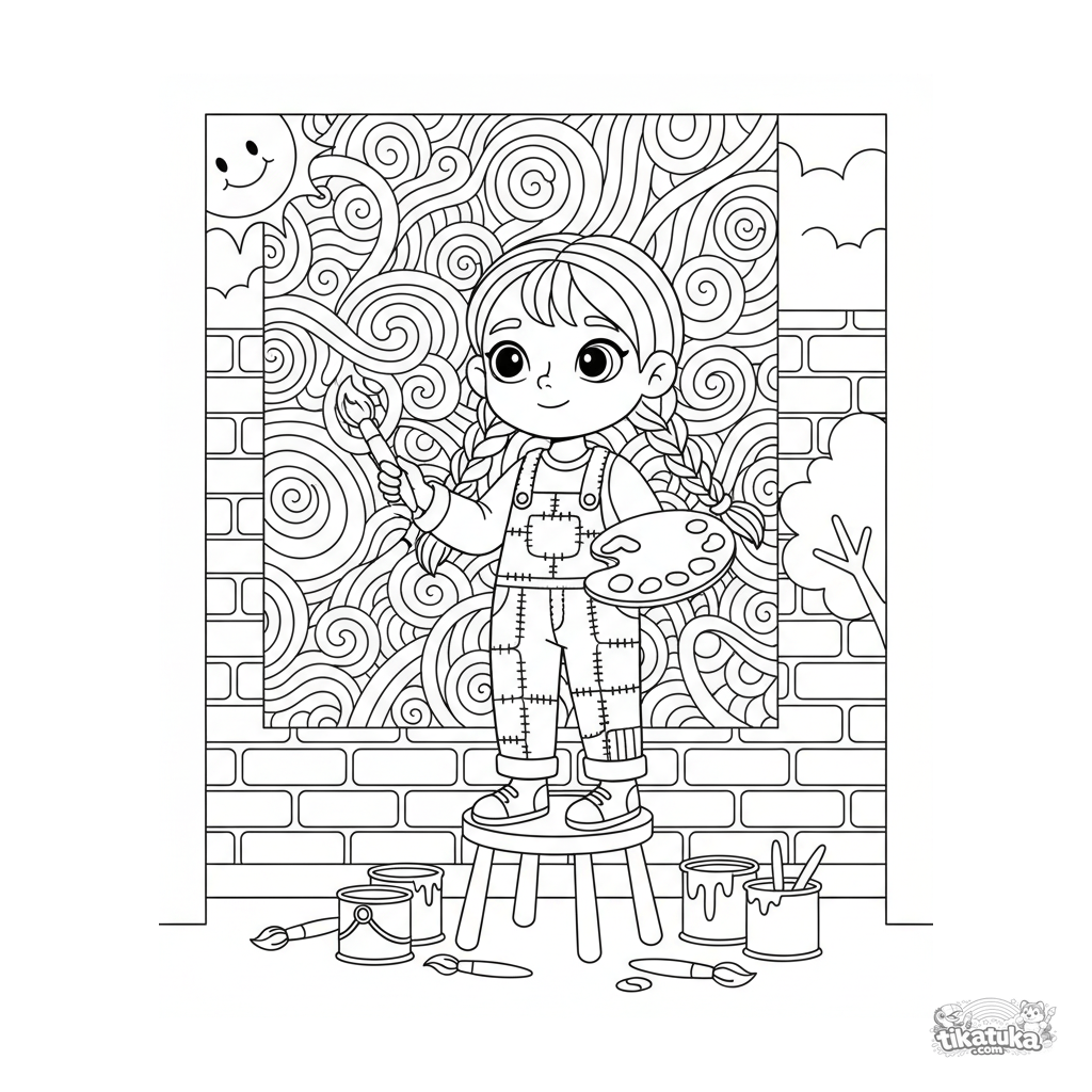 Раскраска с весёлой девочкой в комбинезоне, которая рисует большой мурал на кирпичной стене. Для детей 5-8 лет, развивает творческое мышление.