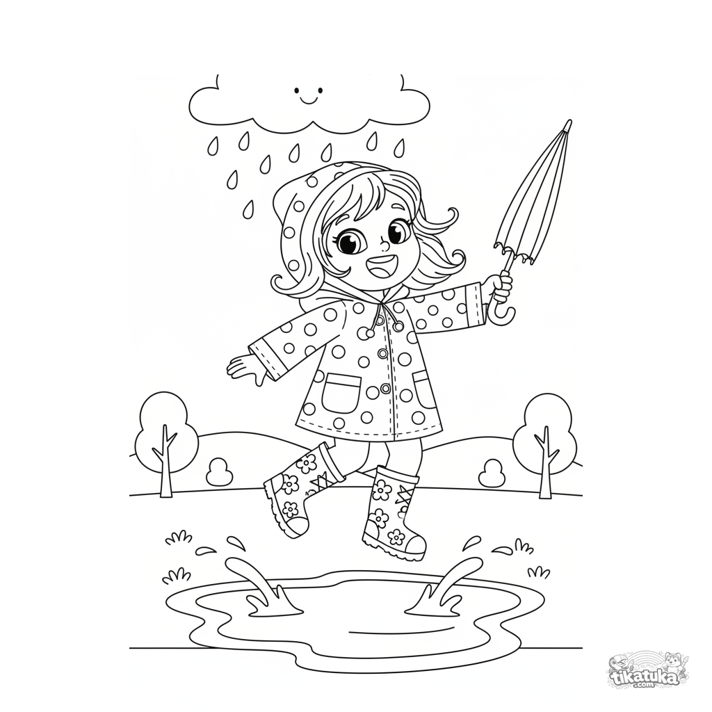 Раскраска для детей: весёлая девочка в дождевике прыгает по луже. Сбалансированная детализация, подходит для возраста 4-6 лет.