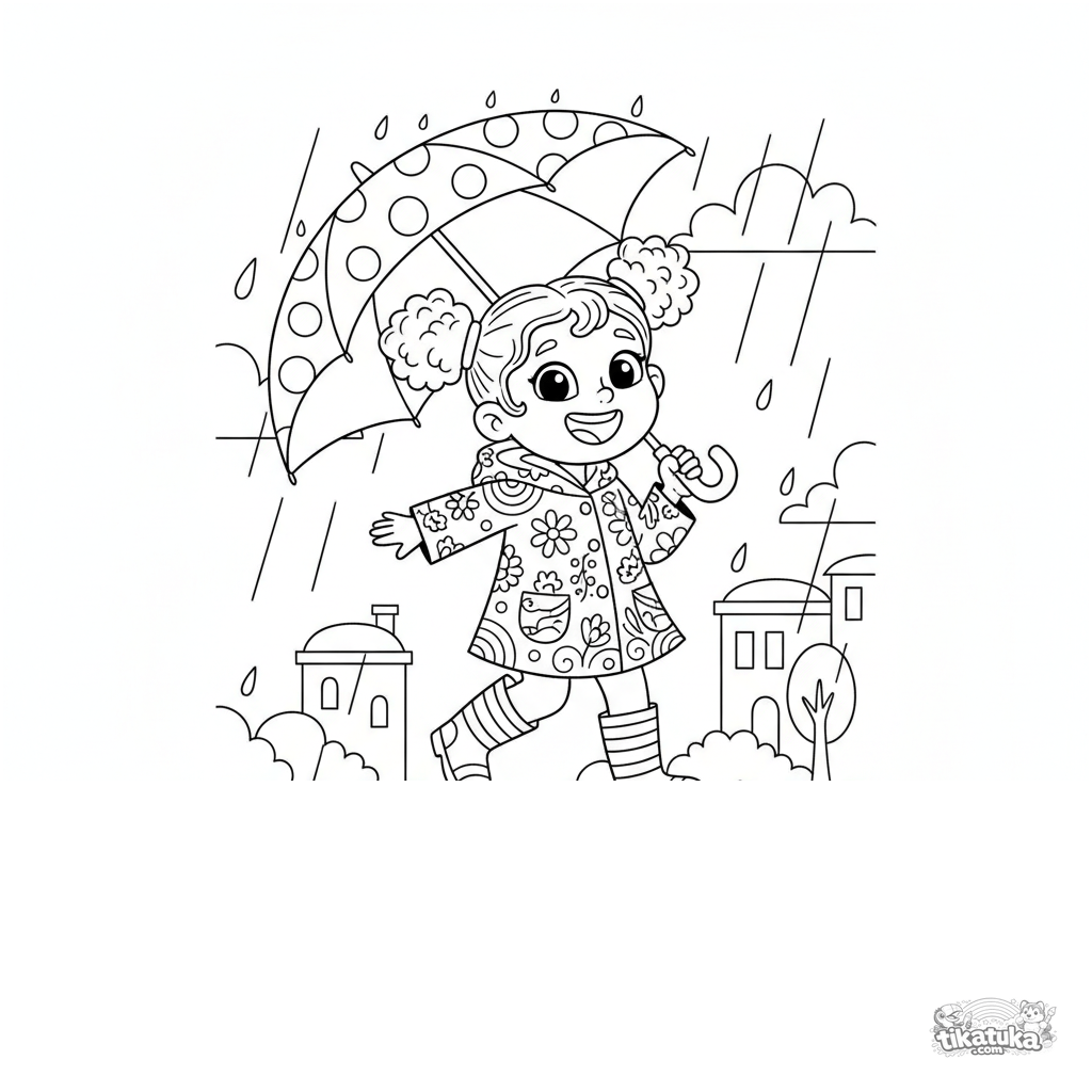 Раскраска с веселой девочкой в дождевике, прыгающей по лужам с зонтиком. Для детей 3-6 лет. Яркая и радостная сцена для творчества.