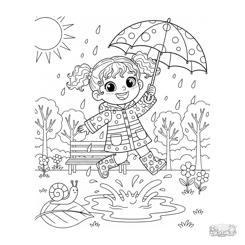 Раскраска с весёлой девочкой в дождевике, прыгающей через лужи с зонтиком в весеннем парке. Для девочек 4-6 лет, средний уровень детализации.