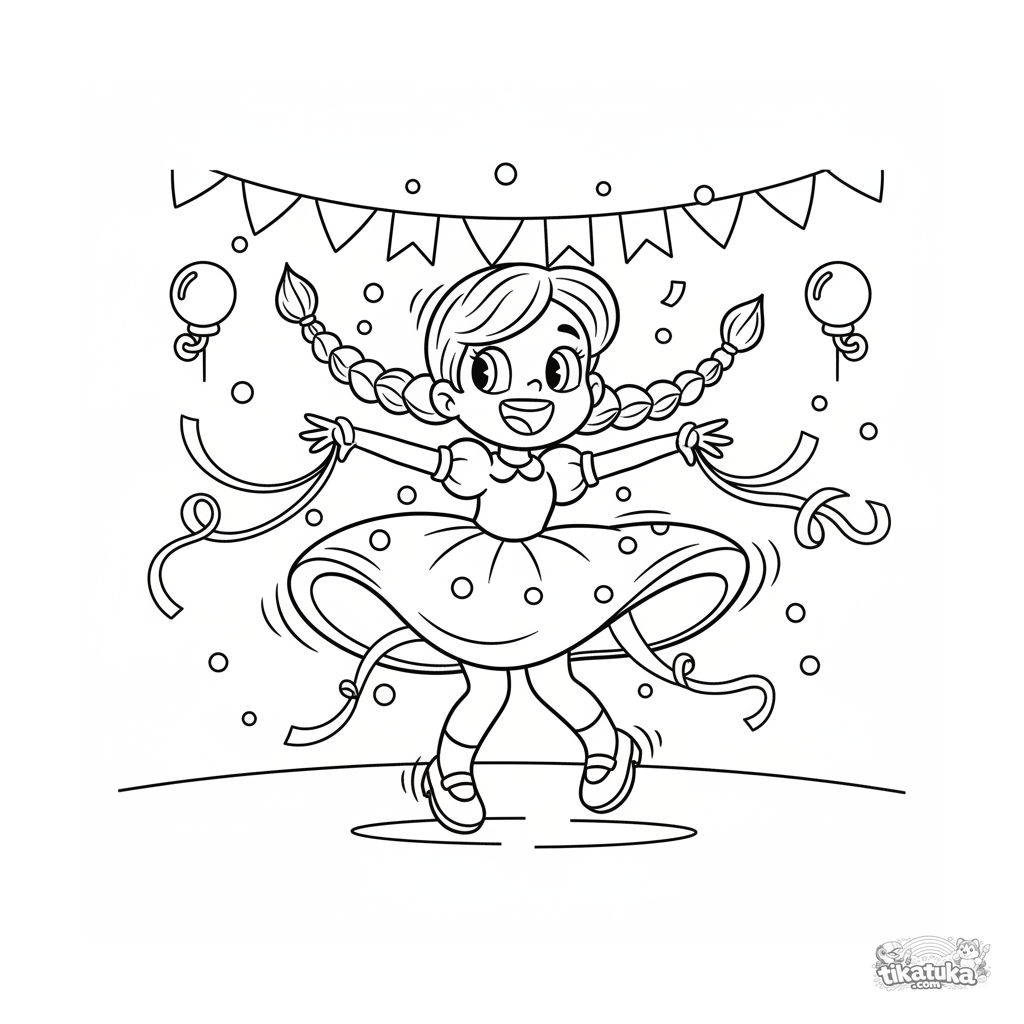 Раскраска для детей 7-9 лет в ретро-стиле: девочка весело кружится с серпантином в праздничном зале. Динамичная сцена танца.