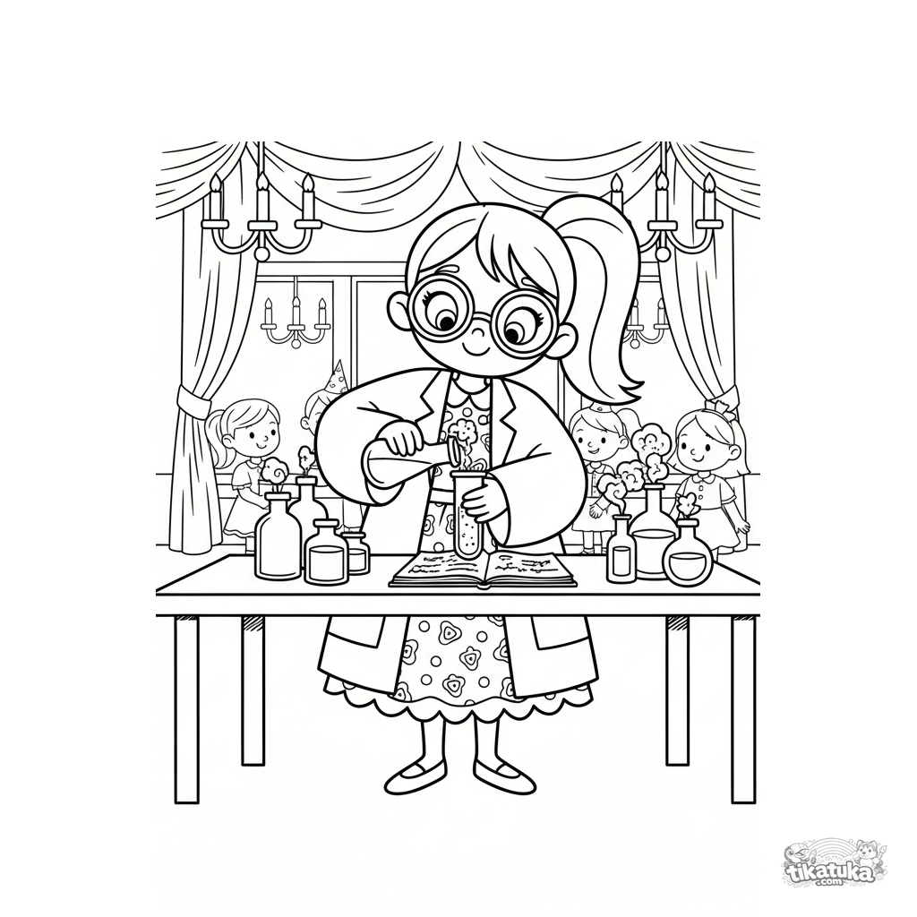 Раскраска для детей 7-9 лет: девочка в лабораторном халате проводит веселый эксперимент со зельями на столе в праздничном зале. Динамичная сцена.