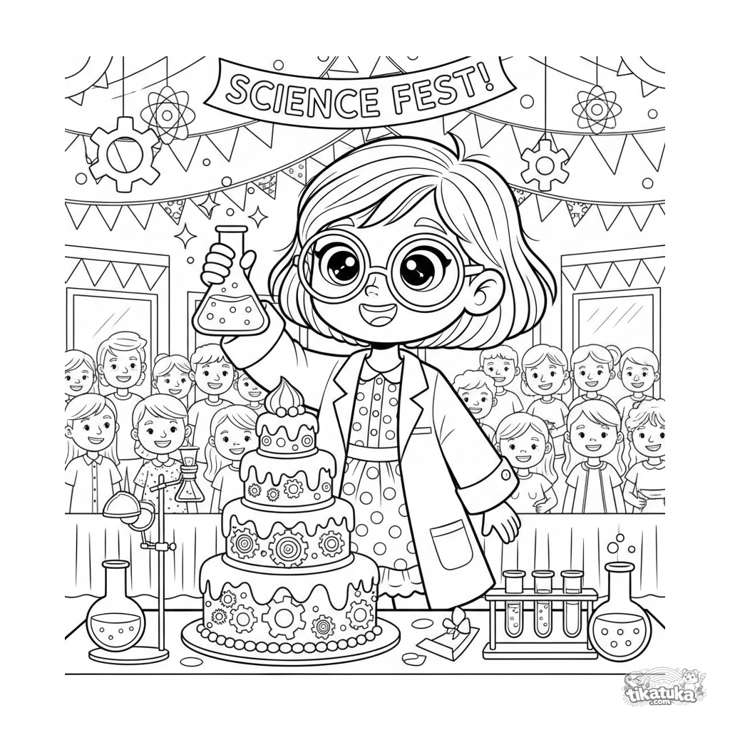 Детальная раскраска для девочек 10-12 лет: юная ученая представляет свой торт-эксперимент на праздничной ярмарке в зале. Много элементов для творческого раскрашивания.