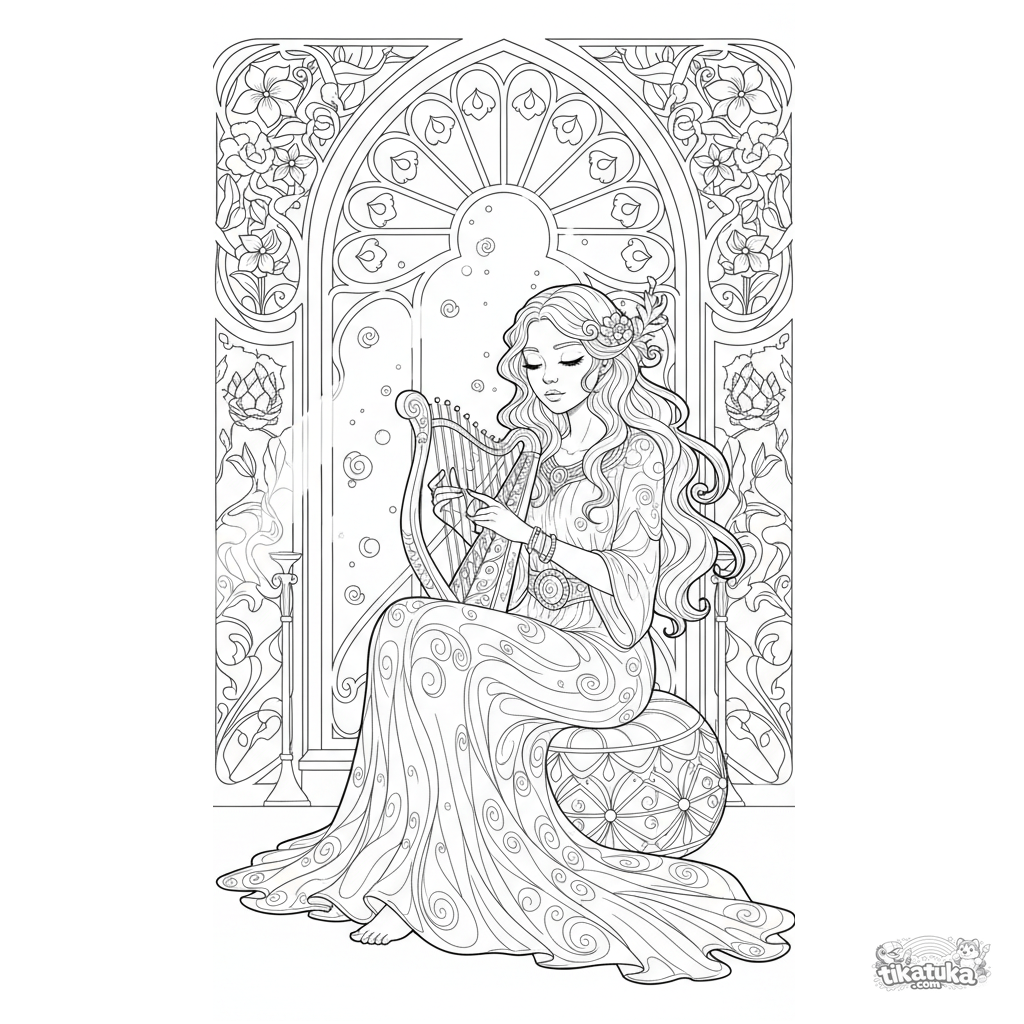 Детальная раскраска в стиле ар-нуво для девочек 10-12 лет: девушка играет на арфе у окна в праздничном зале. Плавные линии, декоративные элементы.