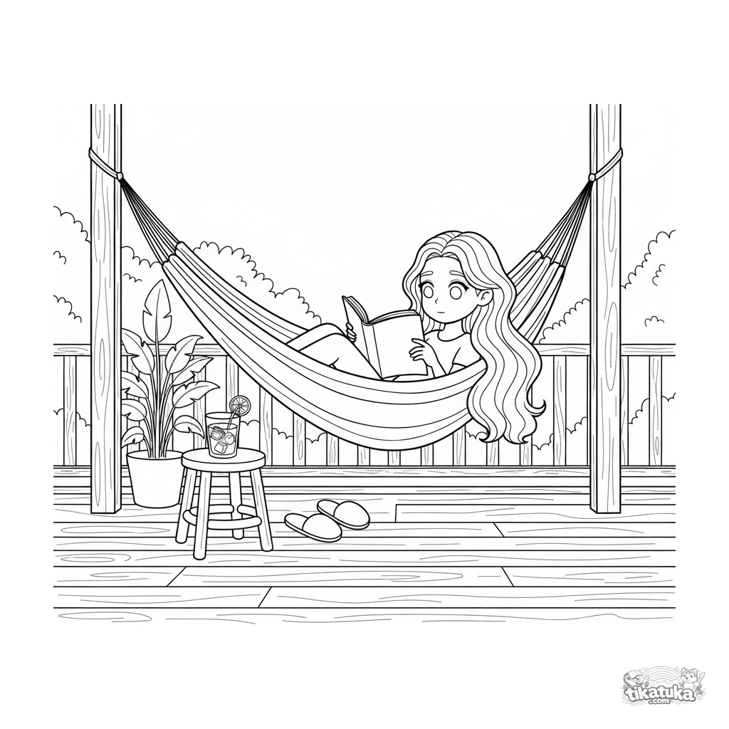 Раскраска для детей 7-9 лет: девочка читает книгу, лежа в гамаке на просторной дачной веранде. Уютная сцена с тапочками и стаканом чая со льдом.