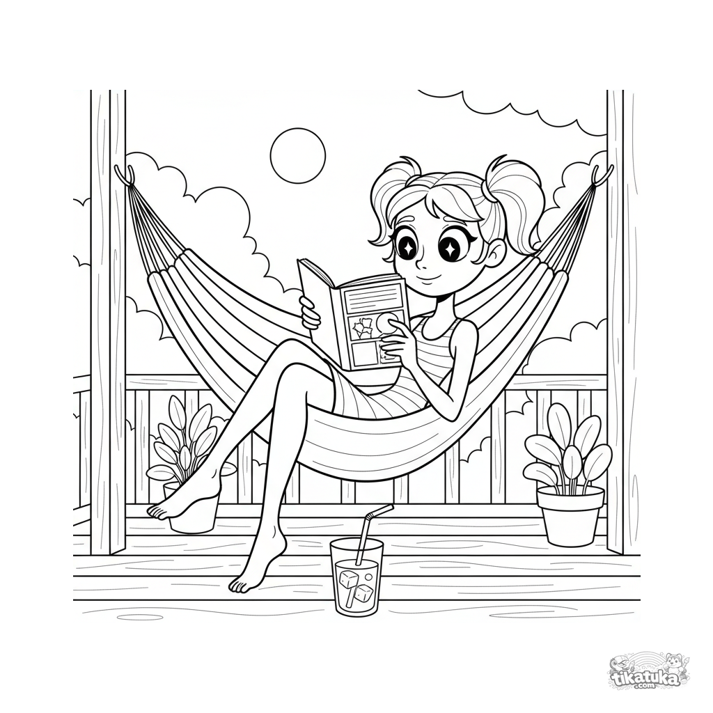 Весёлая раскраска для детей 4-6 лет: девочка читает комикс, лежа в гамаке на дачной веранде. Динамичная поза, стакан с чаем, передаёт настроение летних каникул.