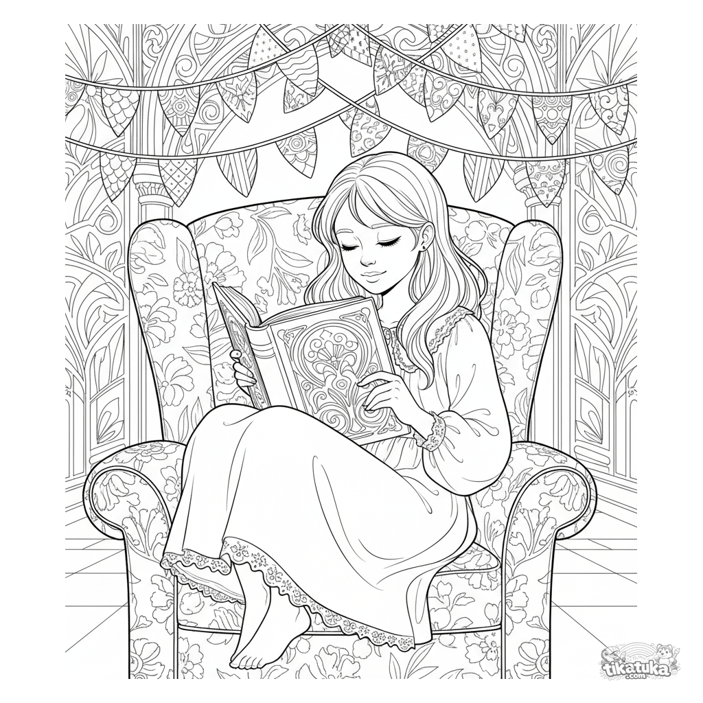 Детальная раскраска для 10-12 лет: девочка читает большую книгу в уютном кресле посреди праздничного зала. Орнаменты, складки одежды, полная фигура, сложные контуры.