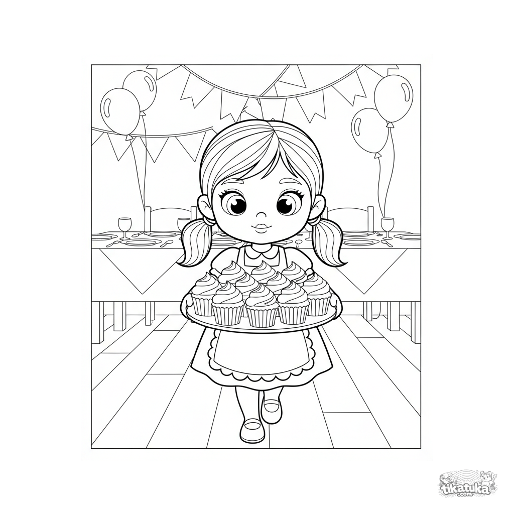 Раскраска для детей 4-6 лет: девочка в фартуке осторожно несет поднос с кексами в украшенном праздничном зале. На заднем плане — праздничный стол и гирлянды.