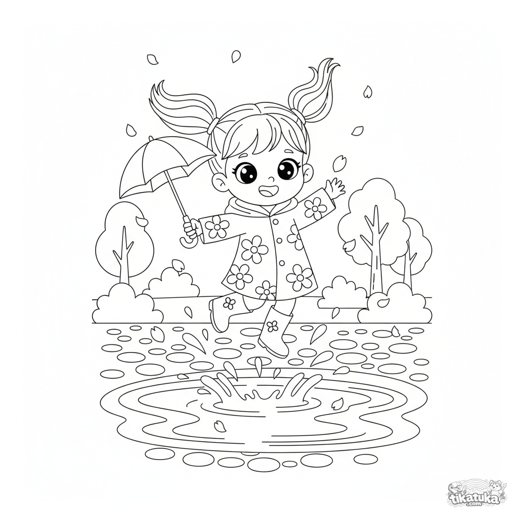 Раскраска для девочек: весёлая девочка в дождевике прыгает по весенним лужам среди лепестков сакуры. Яркая и динамичная сцена для детей 4-6 лет.