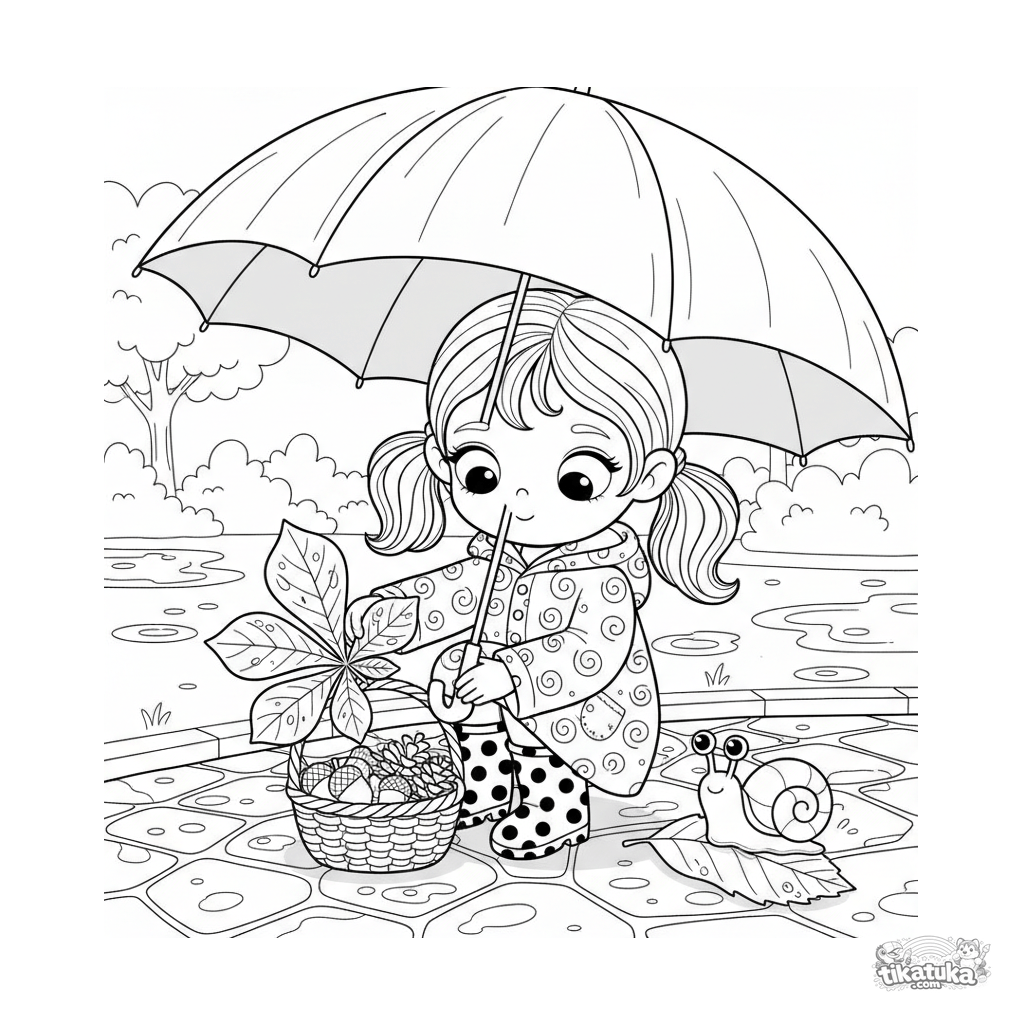 Раскраска для детей 4-6 лет: девочка в дождевике собирает осенние листья и шишки под прозрачным зонтом. Умеренная детализация, понятные формы.