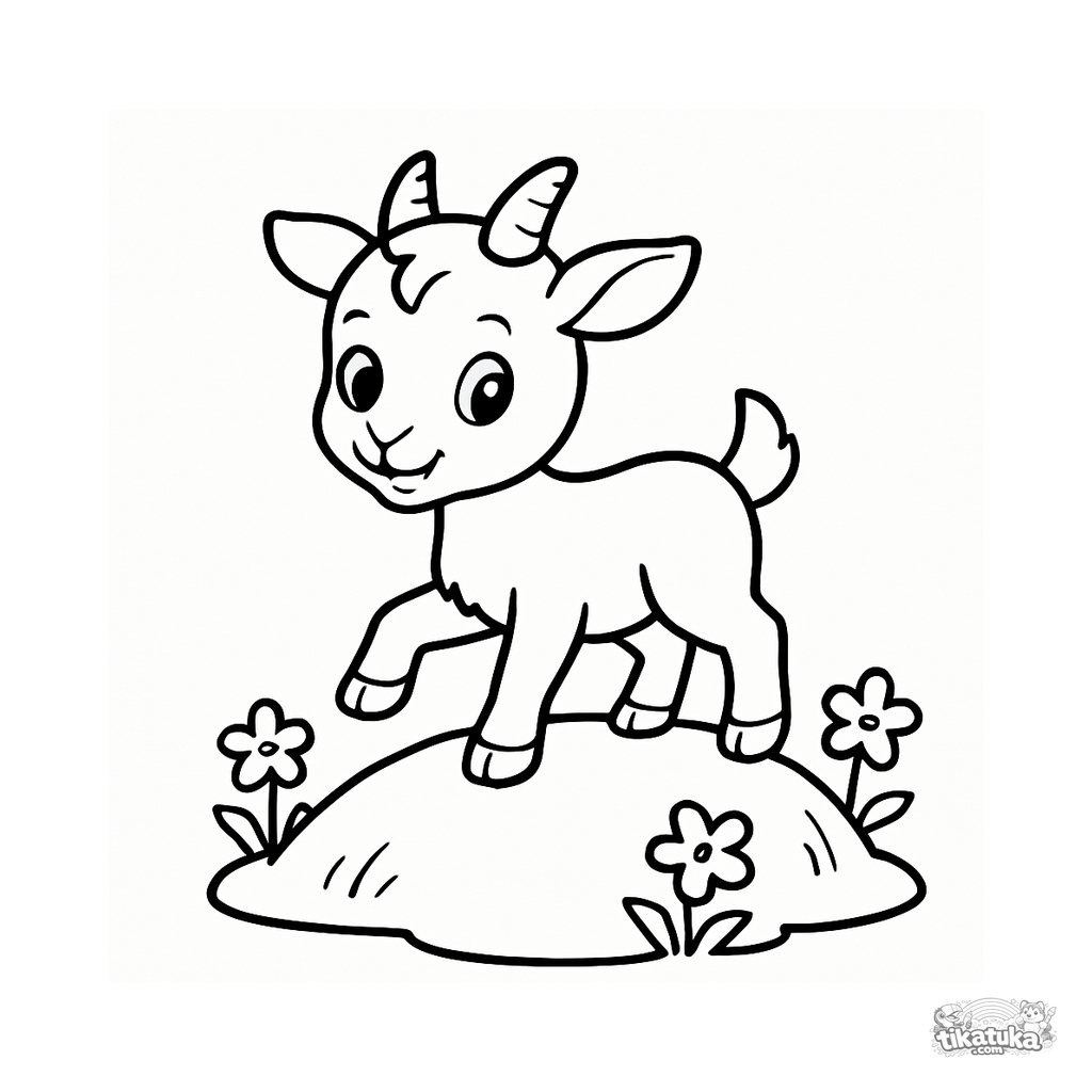 Раскраска для детей 2-5 лет. Игривый козлёнок стоит на травянистом холмике с фиолетовыми цветами, готовый спрыгнуть вниз. Скачать бесплатно.