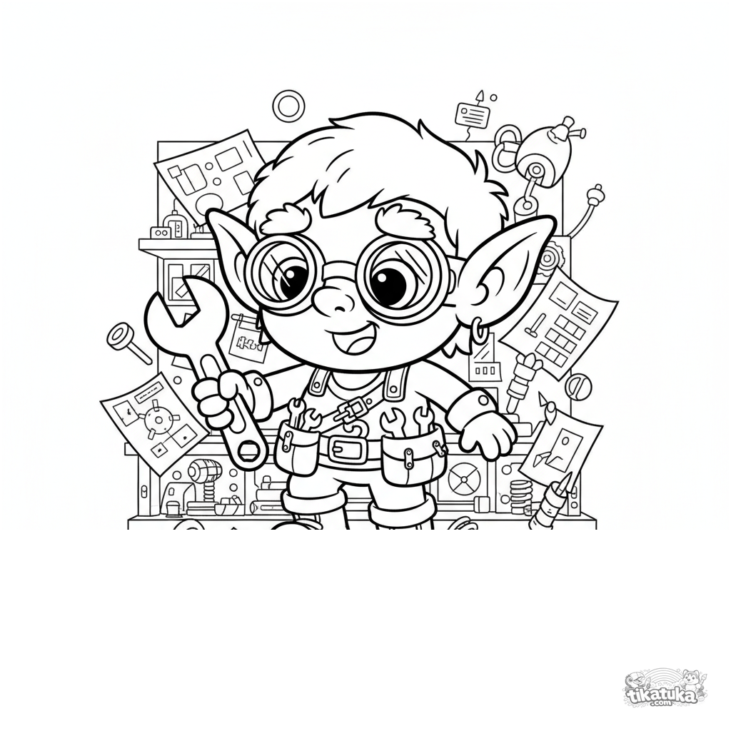 Раскраска для детей 4-6 лет: забавный гоблин-изобретатель в мастерской тестирует свои новые летающие сапоги. Веселая и динамичная сцена.