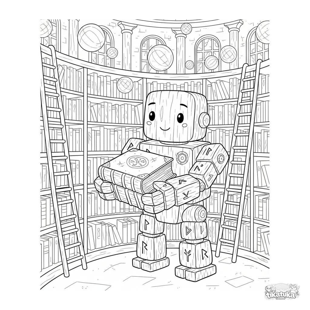Раскраска для детей 7-9 лет: каменный голем-библиотекарь аккуратно расставляет древние книги в огромной волшебной библиотеке.