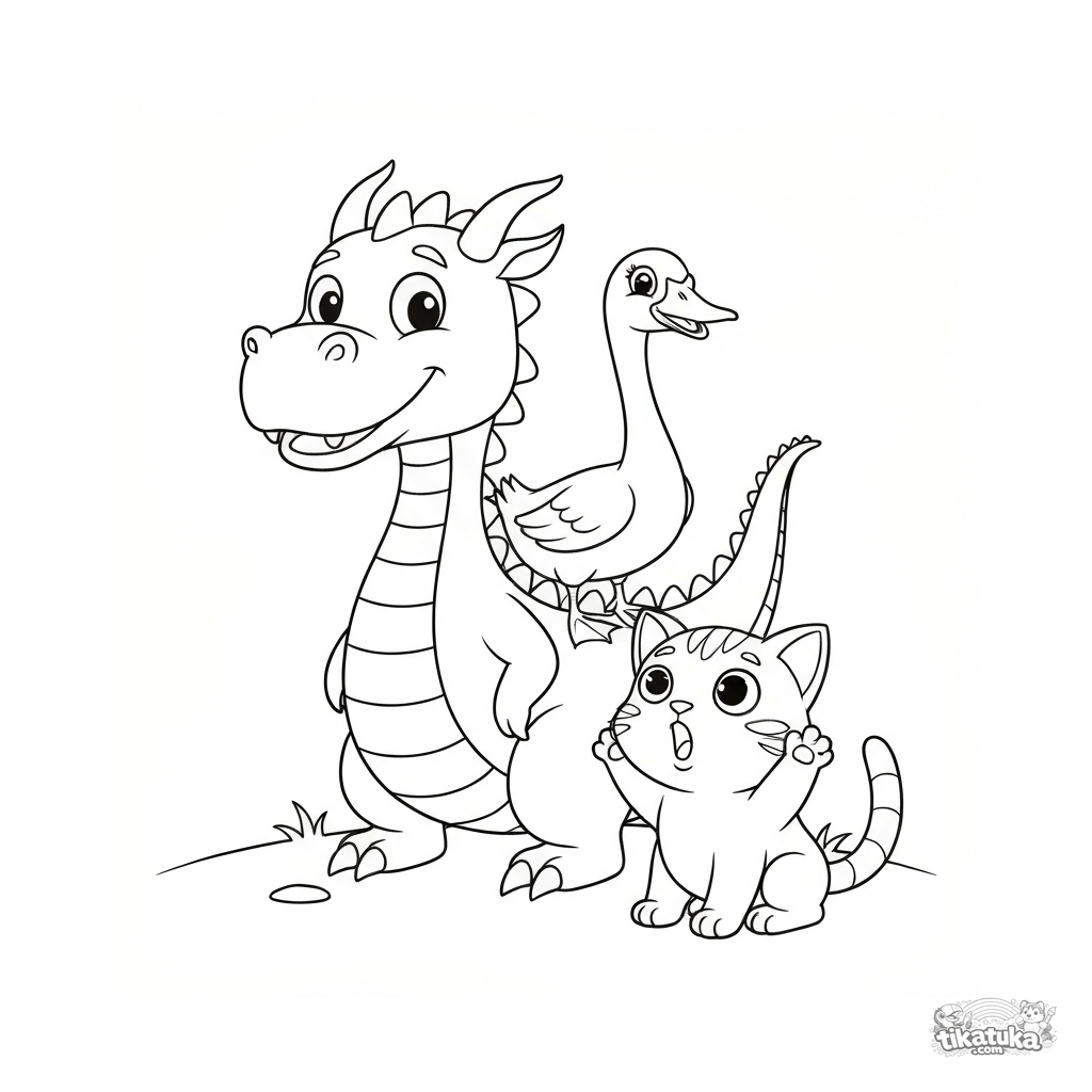 Дружелюбный гусь катается на спине у улыбающегося дракона, а внизу милый котёнок смотрит на них с удивлением. Весёлая и безопасная сцена для раскрашивания.