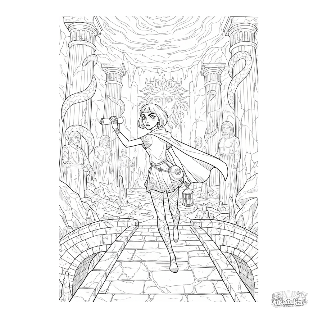Детальная раскраска в стиле гравюры для детей 10-12 лет: гонец со свитком на каменном мосту в логове Горгоны. Много линий, фактур.
