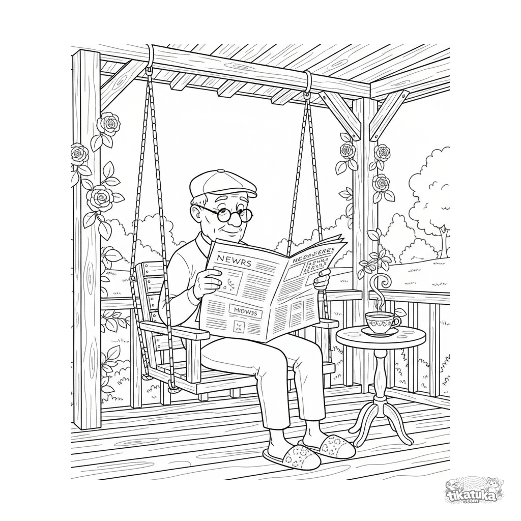 Раскраска для детей 4-6 лет: дедушка читает газету, сидя в подвесных качелях на веранде дачи. Теплая и детализированная семейная сцена.