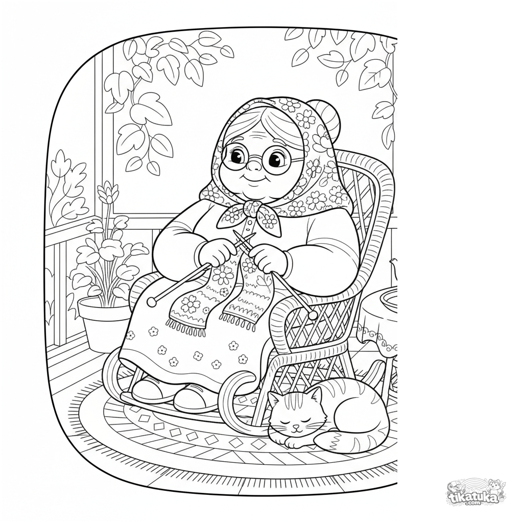 Раскраска для детей 4-6 лет: бабушка вяжет на дачной веранде, рядом спит кот и стоит чайный сервиз. Уютная сцена для спокойного раскрашивания.