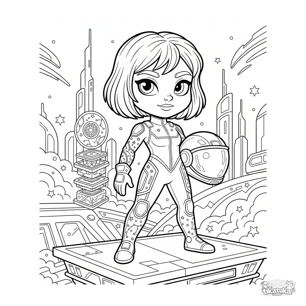Раскраска в стиле графического романа для девочек 10-12 лет: футуристический комбинезон с вышивкой созвездий на космической платформе с голограммами.