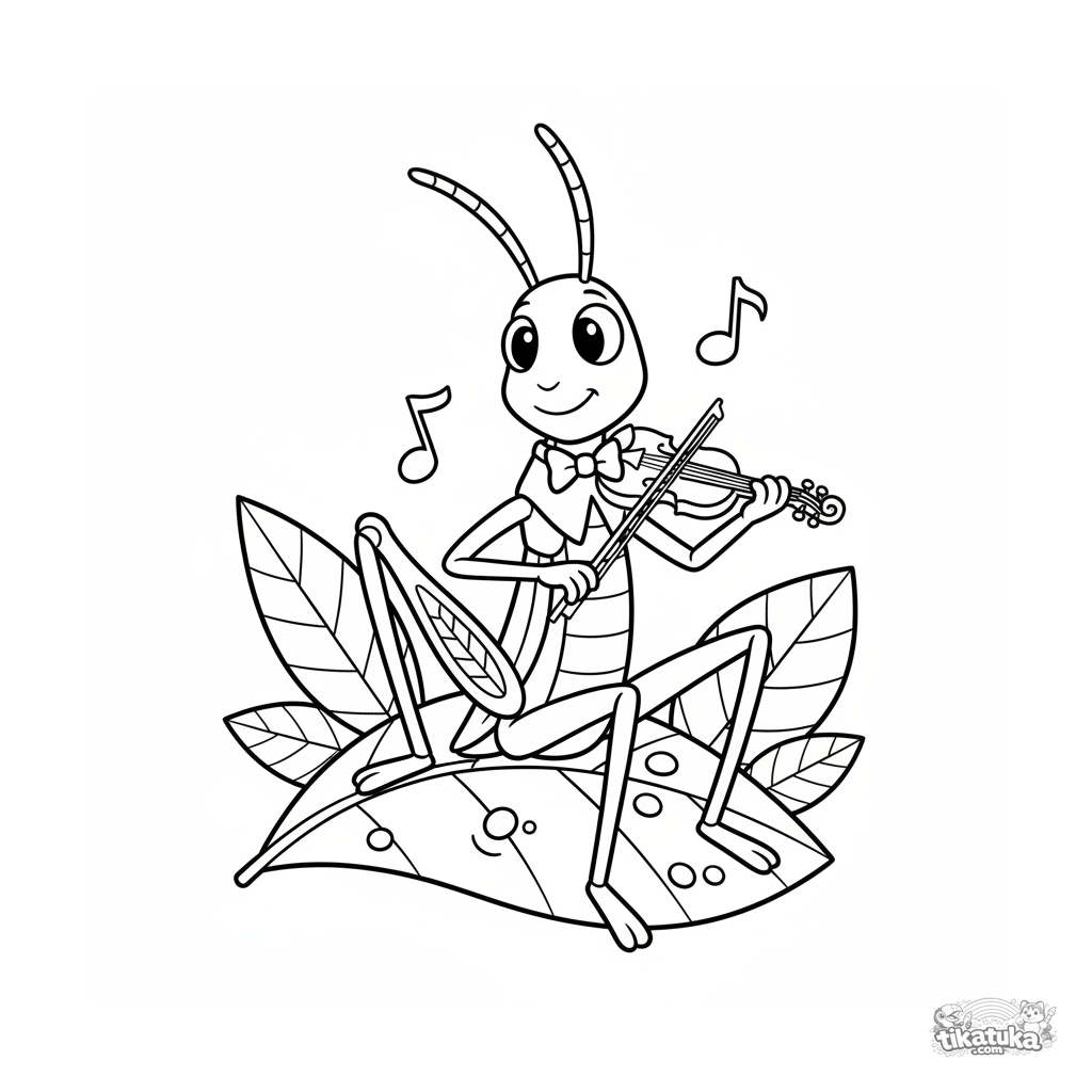 Раскраска для детей 7-9 лет в ретро-стиле: элегантный кузнечик в бабочке играет на скрипке, сидя на листе с росой. Забавная и необычная сцена.