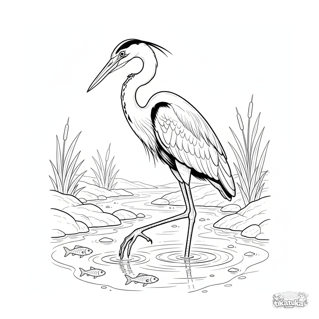 Раскраска в стиле акварельного наброска для детей 7-9 лет: высокая цапля терпеливо стоит на мелководье широкого ручья в поисках рыбы.