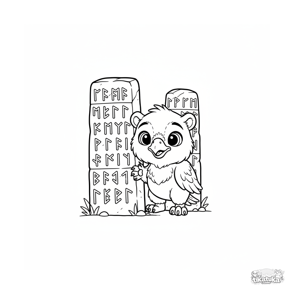 Раскраска для детей 4-6 лет: пушистый грифончик с любопытством выглядывает из-за древнего рунного монолита. Четкие формы, умеренная детализация, сбалансированная композиция.