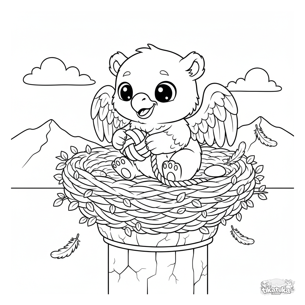 Раскраска с милым грифончиком, который играет с верёвкой в своём гнезде на каменном столбе. Для детей 4-6 лет, в милом чиби-стиле.