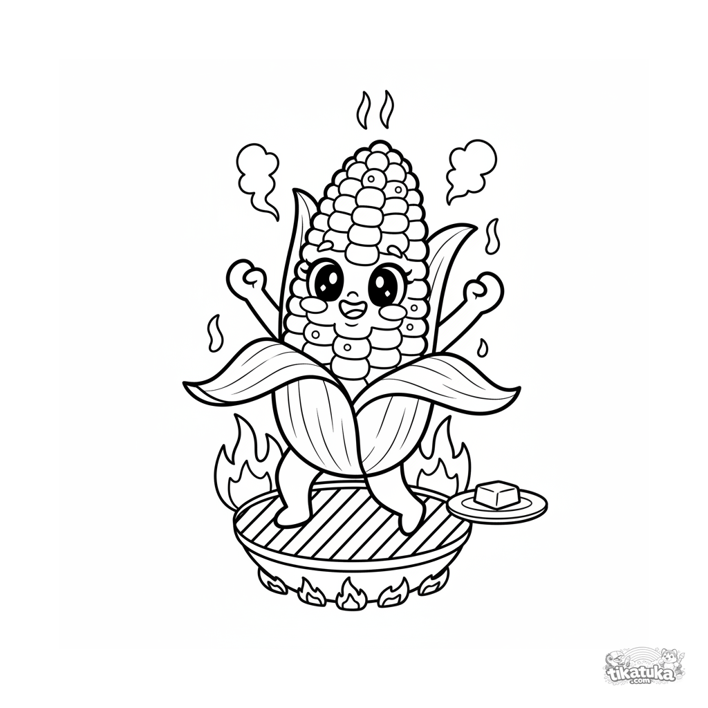 Раскраска для детей 7-9 лет: весёлый початок кукурузы танцует на решётке гриля. Динамичная поза, летняя атмосфера пикника.