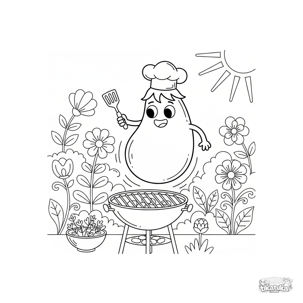 Раскраска с баклажаном-поваром на садовом гриле для детей 4-6 лет. Весёлый овощ в поварском колпаке готовит себя, вокруг широкие белые поля.
