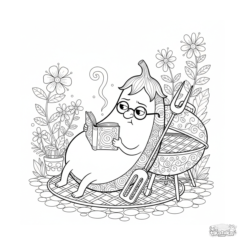 Детальная раскраска для детей 10-12 лет. Ломтик баклажана в очках читает книгу, отдыхая на садовом гриле. Свободные контуры, набросок акварелью.