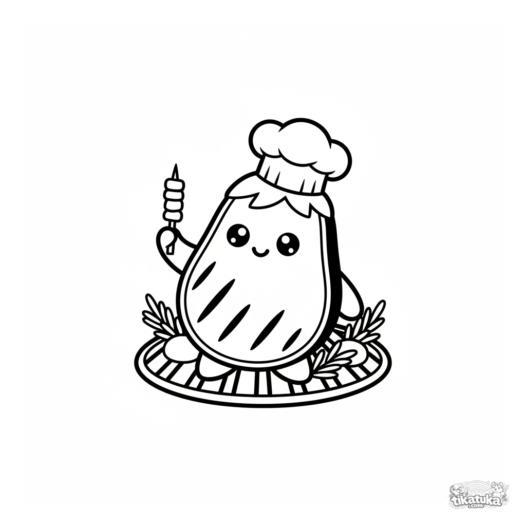 Раскраска для малышей: весёлый ломтик баклажана с улыбкой и поварским колпаком на садовом гриле. Простые формы, широкие поля.