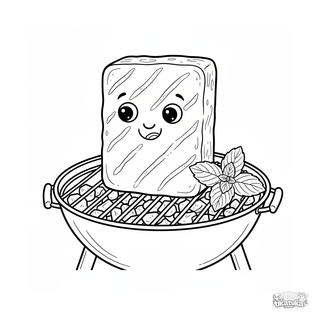 Сложная раскраска для детей 10-12 лет: сыр халлуми с узором от гриля и лицом из оливок. Бесплатный рисунок для печати с текстурой.