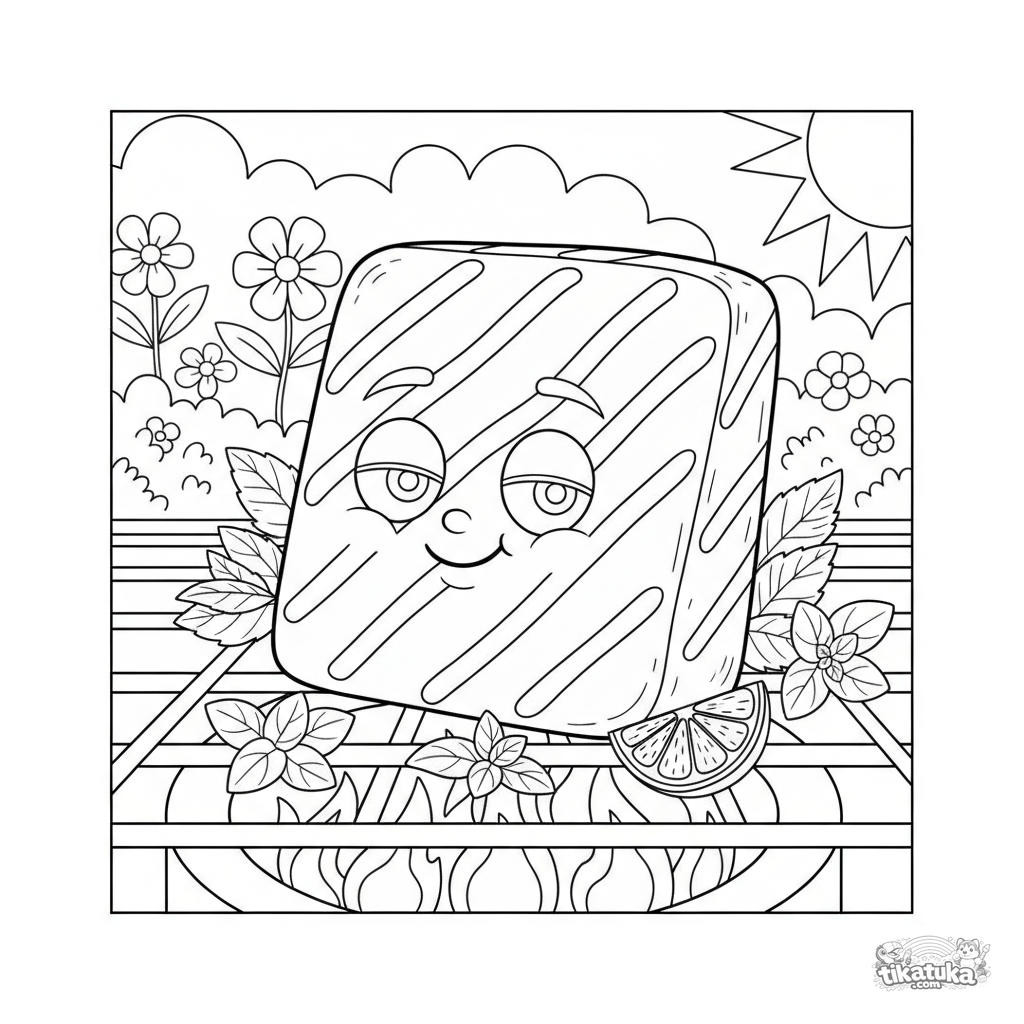 Детальная раскраска для детей 10-12 лет: сыр халлуми с чёткими полосками от гриля, травами и лимоном в саду. Реалистичная текстура сыра и детали сцены.