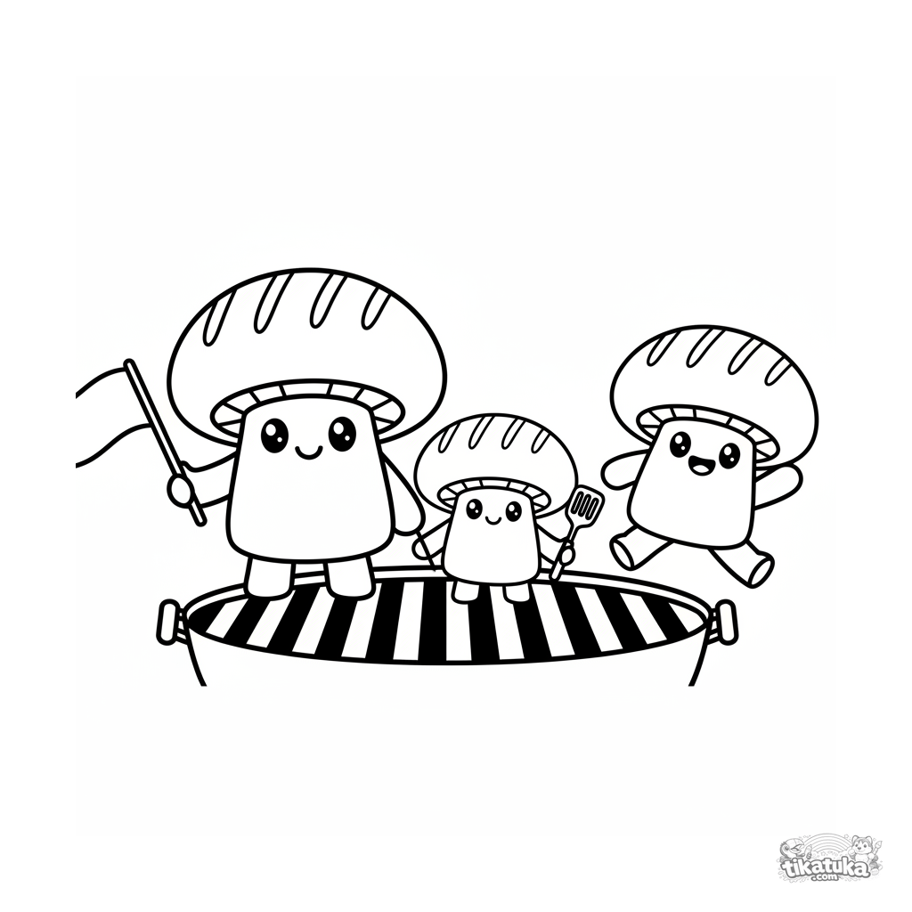 Простая раскраска для малышей 2-3 лет. Три весёлых гриба-портобелло стоят на гриле и машут. Очень крупные, простые формы.