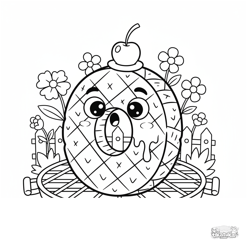 Раскраска для детей 4-6 лет: удивлённое колечко ананаса с вишней-шляпкой на садовом гриле. Классический мультяшный стиль, умеренная детализация.