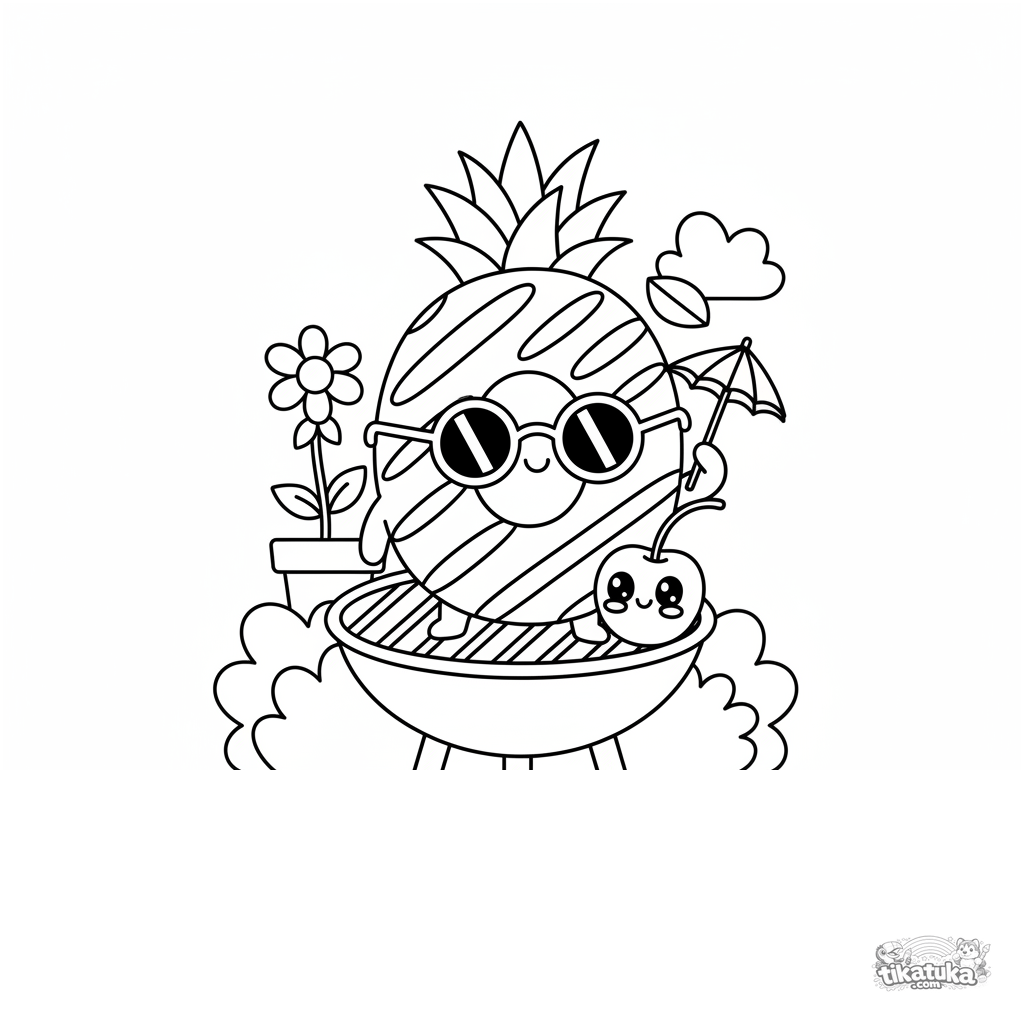 Раскраска для детей 4-6 лет: колечко ананаса в солнечных очках и с зонтиком отдыхает на гриле. Весёлая и простая сцена для печати.