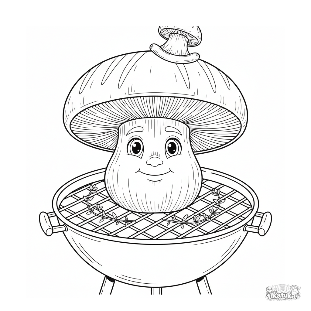 Сложная раскраска для детей 10-12 лет: большой гриб портобелло с текстурой жабр и отметинами от гриля. Реалистичный рисунок для печати.