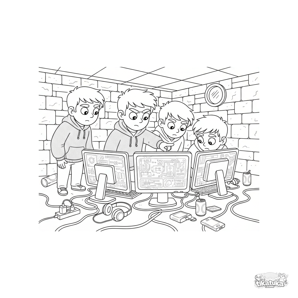 Раскраска для детей 10-12 лет: команда юных хакеров работает вместе в подвале, окружённая мониторами и проводами. Сцена полна деталей для творческого раскрашивания.