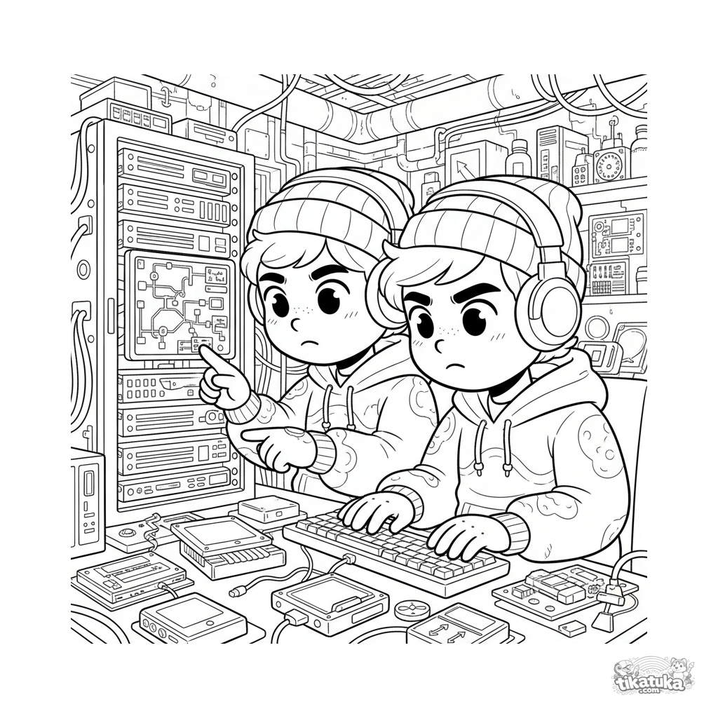 Раскраска для детей 10-12 лет: два хакера работают в подвале с серверами и экранами. Сцена полна деталей: провода, клавиатуры, мигающие индикаторы.