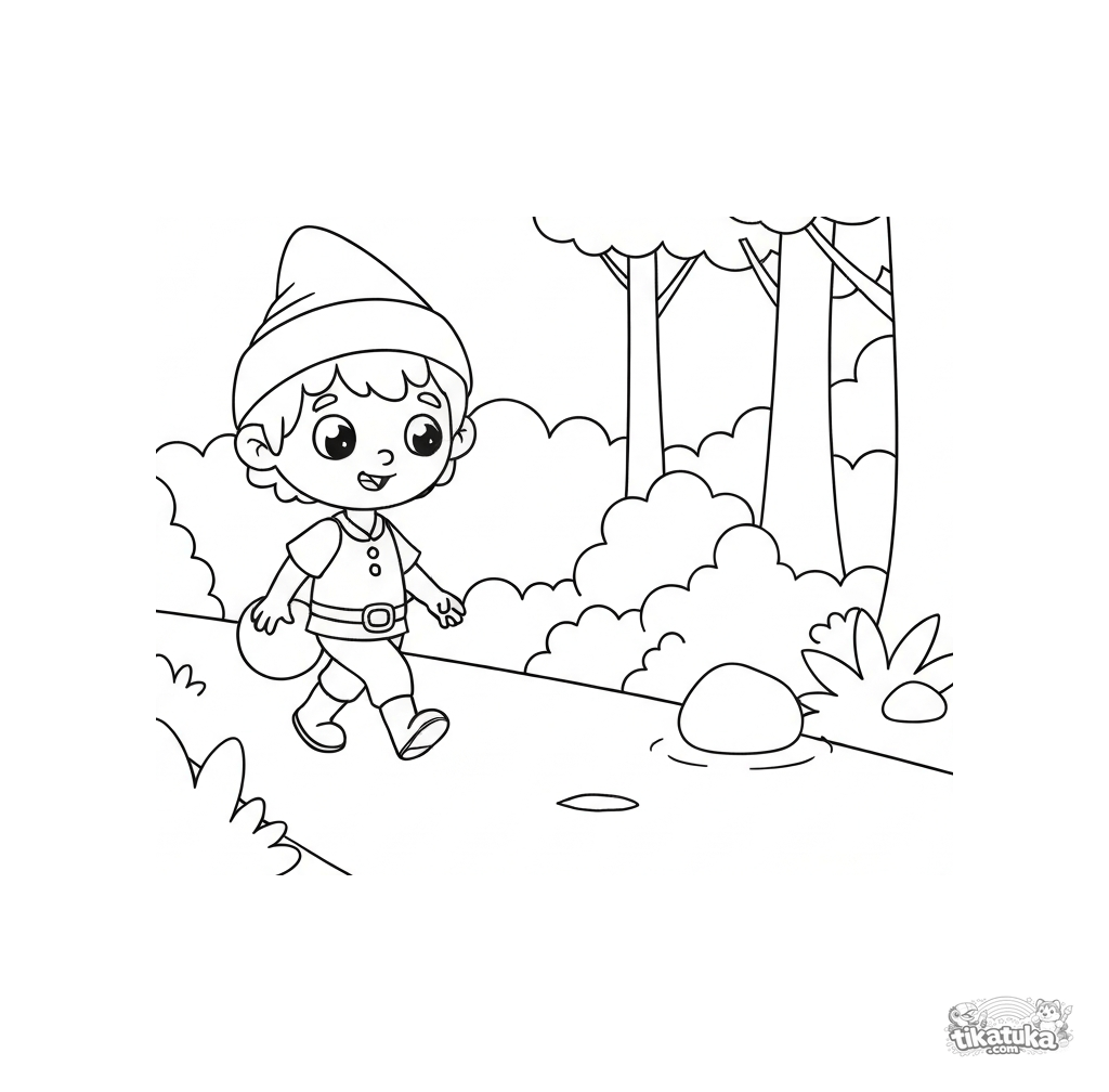 Раскраска для детей 2-5 лет. Гензель идет по лесной тропинке и бросает белый камешек. Простая сцена из сказки с широкими полями. Скачать бесплатно.