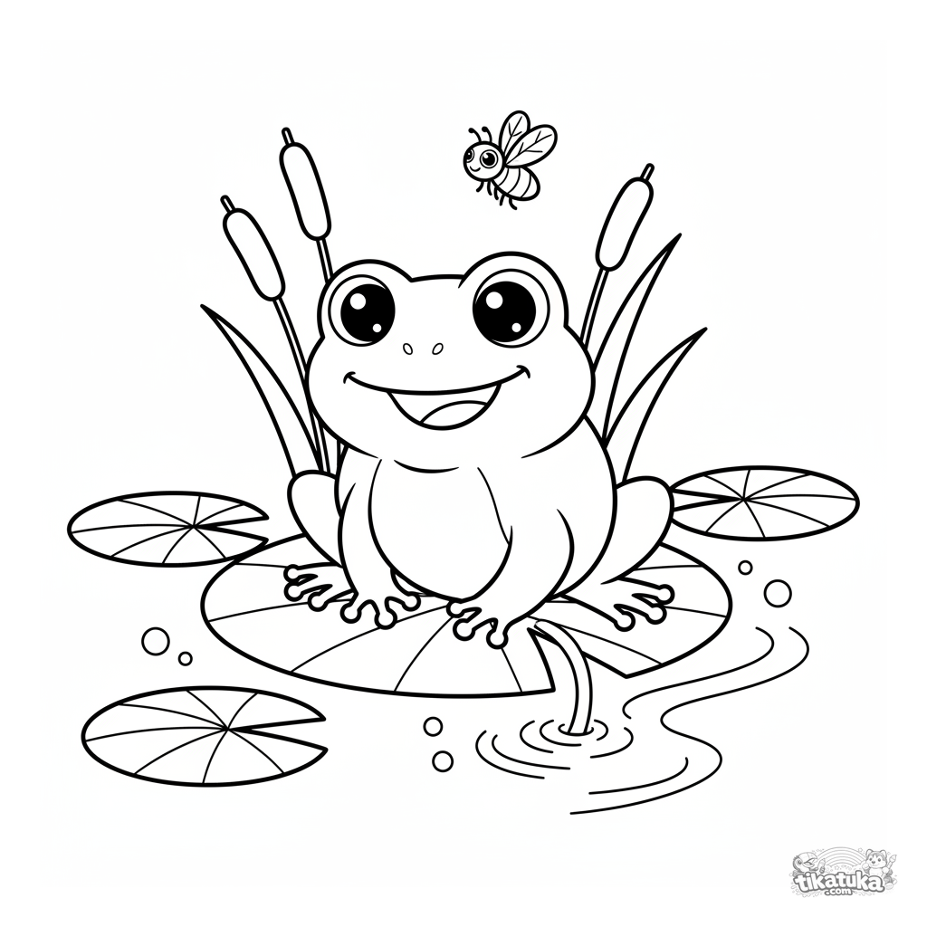 Очень простая раскраска для малышей 2-3 лет: весёлая лягушка сидит на кувшинке у ручья. Крупные закрытые формы, минимум деталей, толстые контуры.
