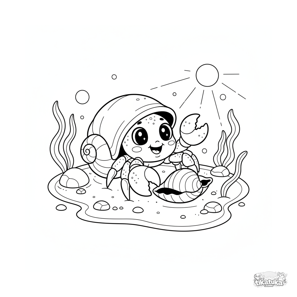Раскраска для детей 4-6 лет: милый краб-отшельник выбирает новый домик в солнечном приливном бассейне. Чиби-стиль, простые формы.