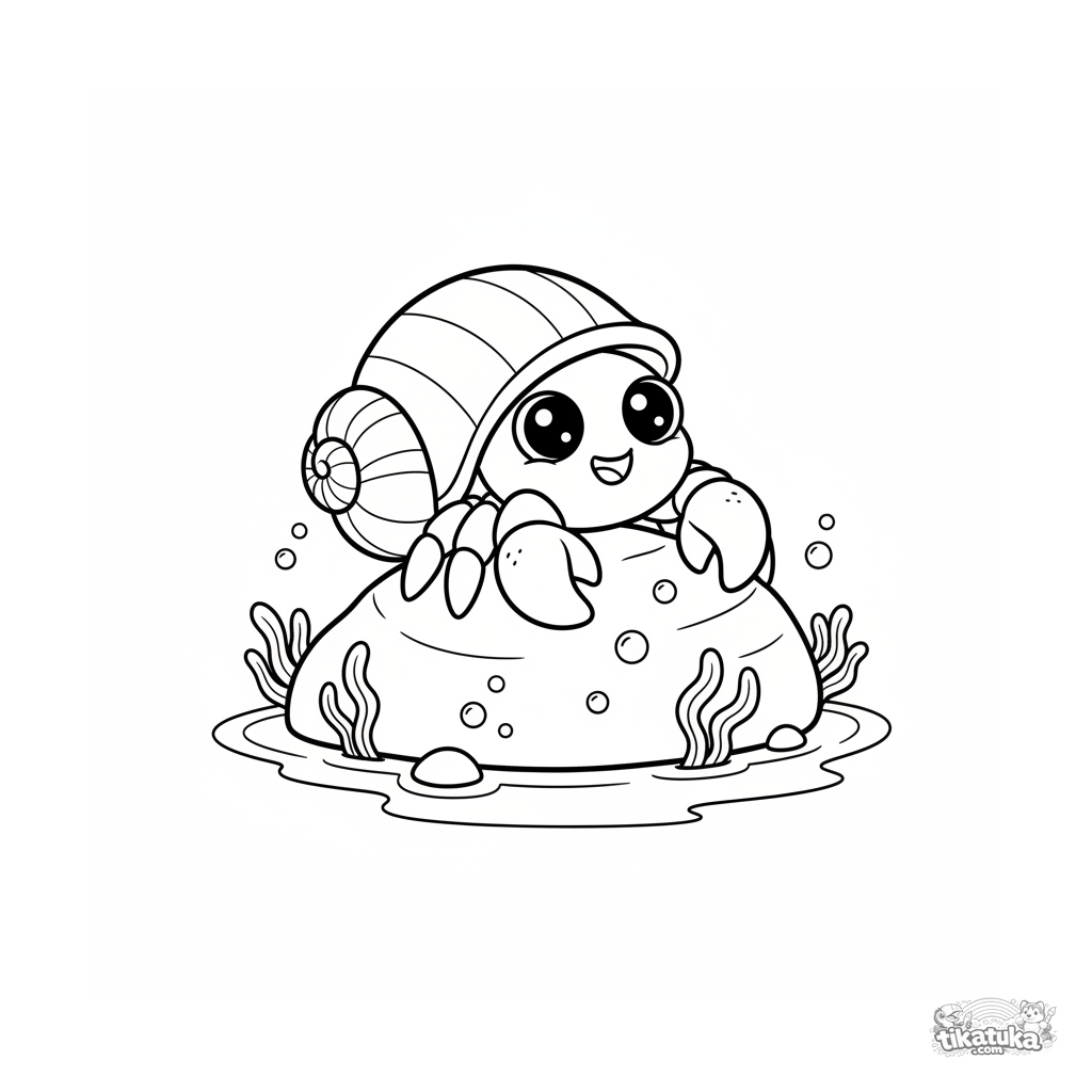 Раскраска с милым ракушечным крабом, исследующим солнечную лужу на мелководье. Для детей 4-6 лет, простые и понятные формы.