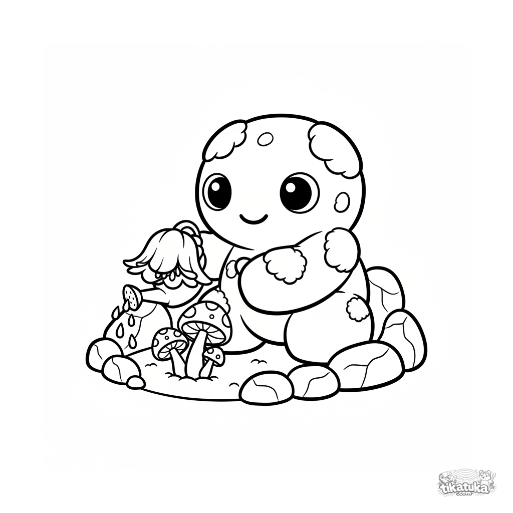 Раскраска для малышей 2-3 лет: добрый мшистый голем поливает из лейки-цветка маленький садик со светящимися грибочками.