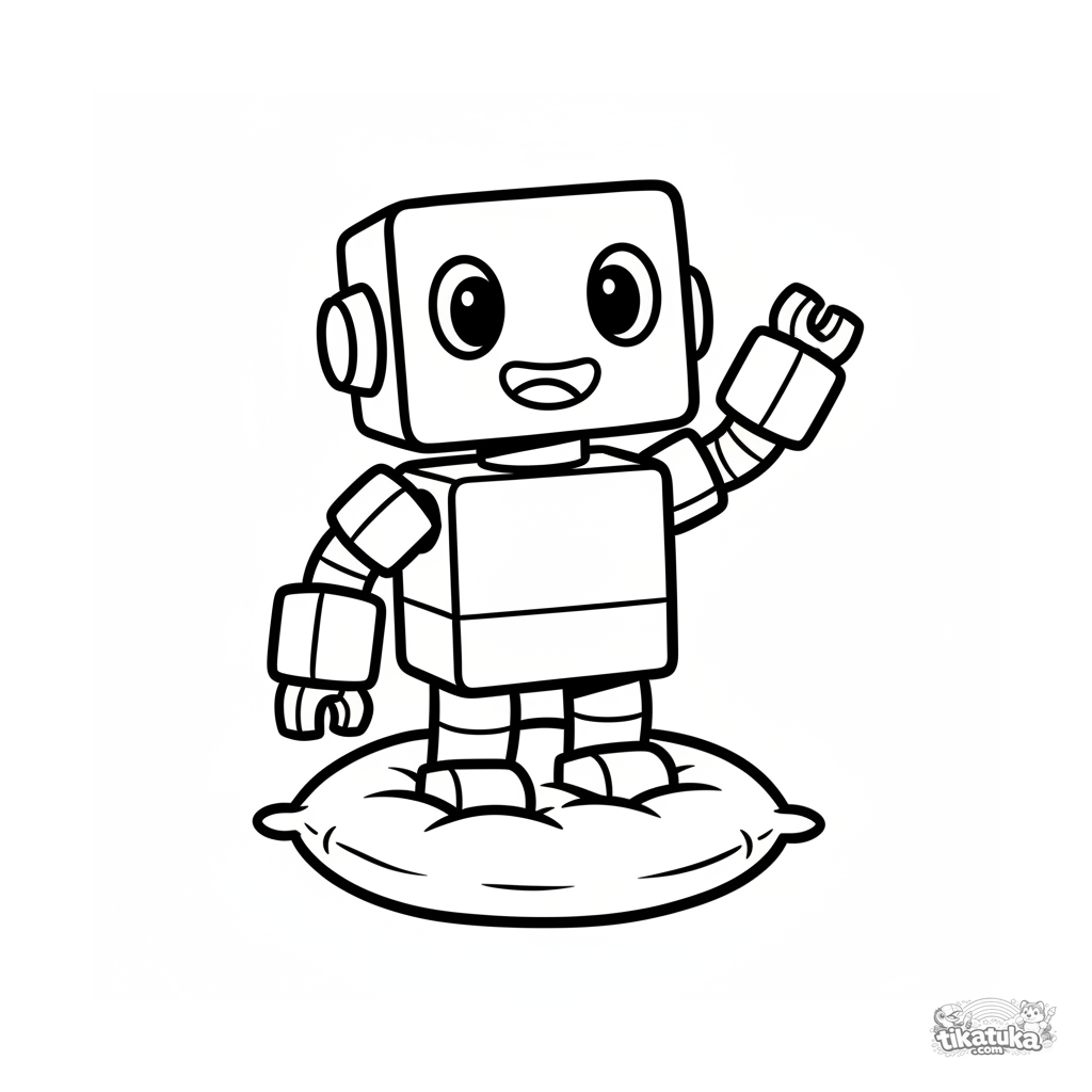 Раскраска для малышей: весёлый блочный робот машет рукой, стоя на мягкой подушке. Крупные простые формы, легко раскрашивать.