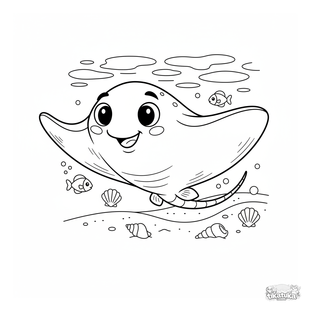 Раскраска для детей 7-9 лет: улыбающийся скат плавно скользит над песчаным дном на мелководье, освещённом солнцем. Динамичная поза, простой фон.