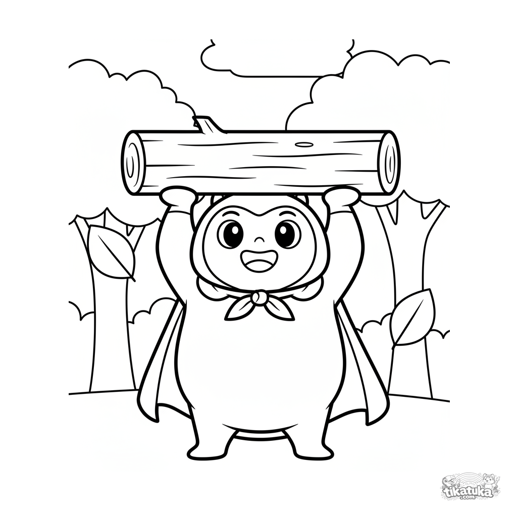Очень простая раскраска для малышей 2-3 лет: улыбающийся сильный супергерой поднимает большое бревно в лесу. Крупные фигуры, толстые контуры, много свободного места.