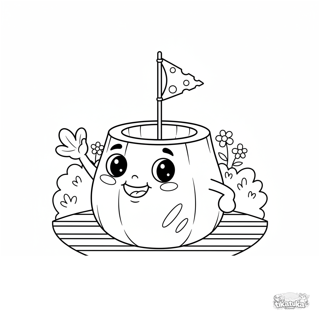 Раскраска для детей 7-9 лет: весёлый кабачок в виде лодочки с парусом из сыра готовится на садовом гриле. Сказочный сюжет.