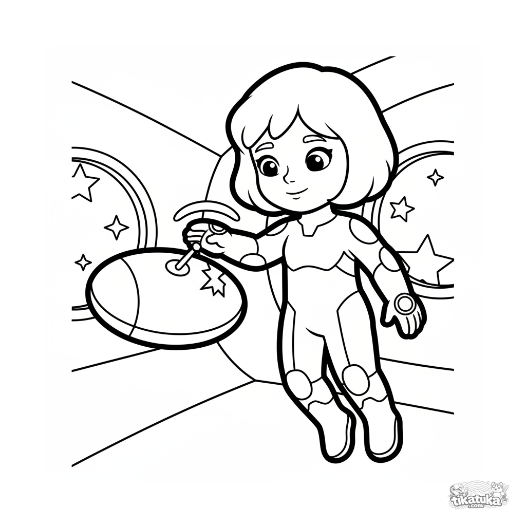Простая раскраска для малышей 2-3 лет: герой-целитель в белом костюме парит в коридоре космической станции, помогая спутнику.