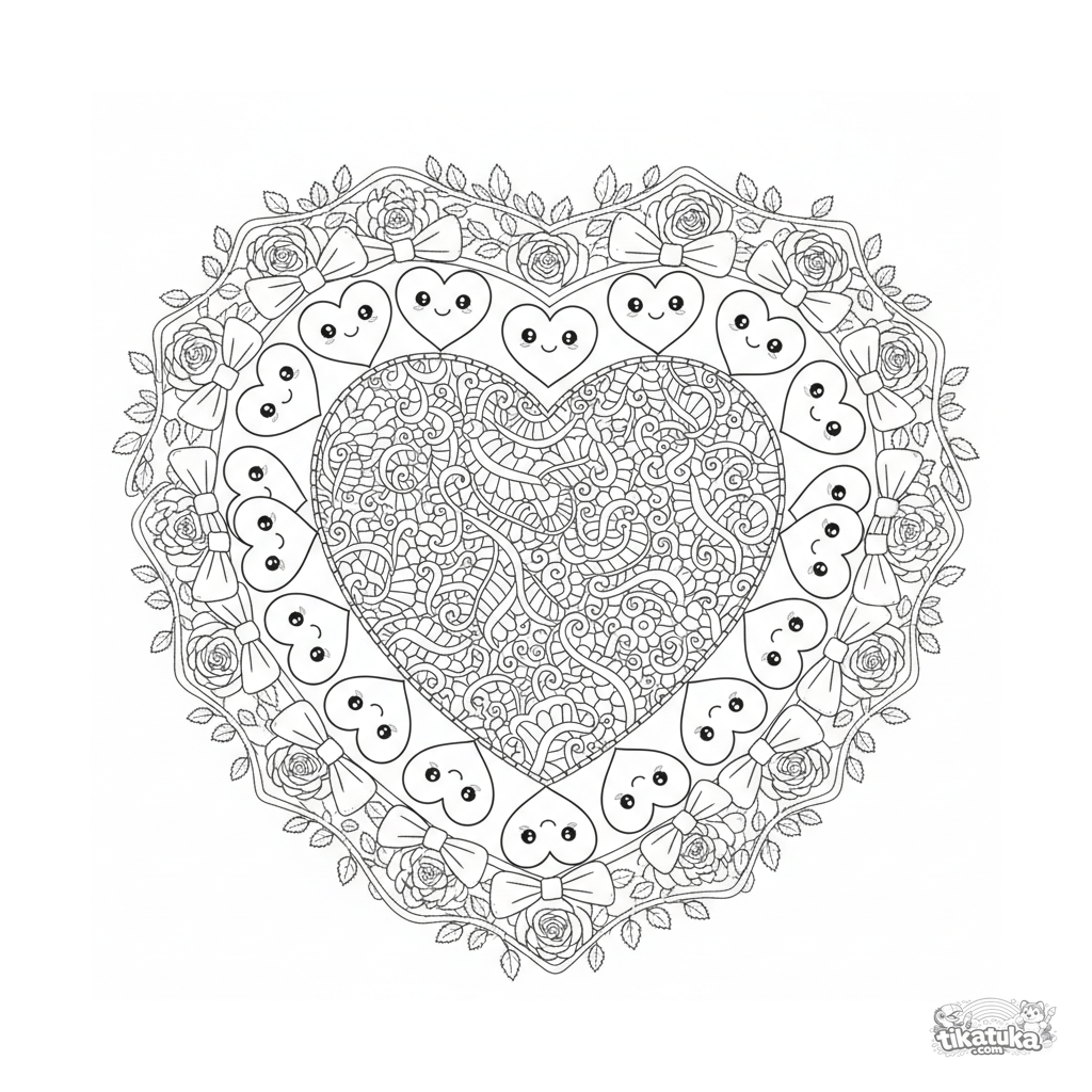 Изысканная мандала в форме сердца с цветочными и кружевными узорами. Сложный симметричный рисунок в романтическом стиле для детей 10-12 лет.